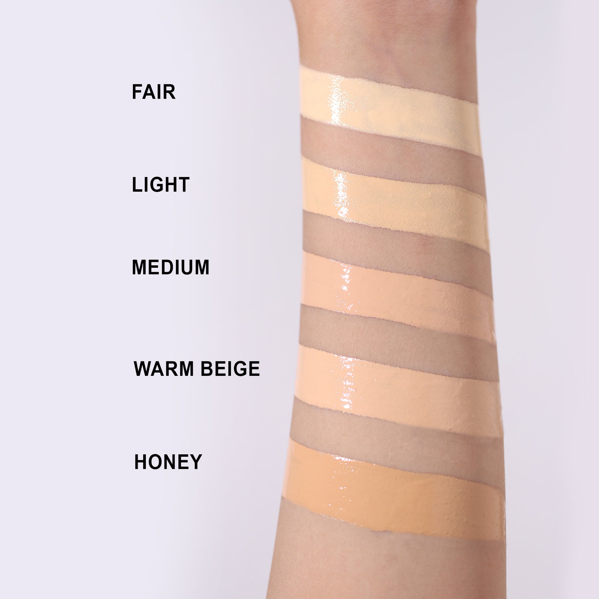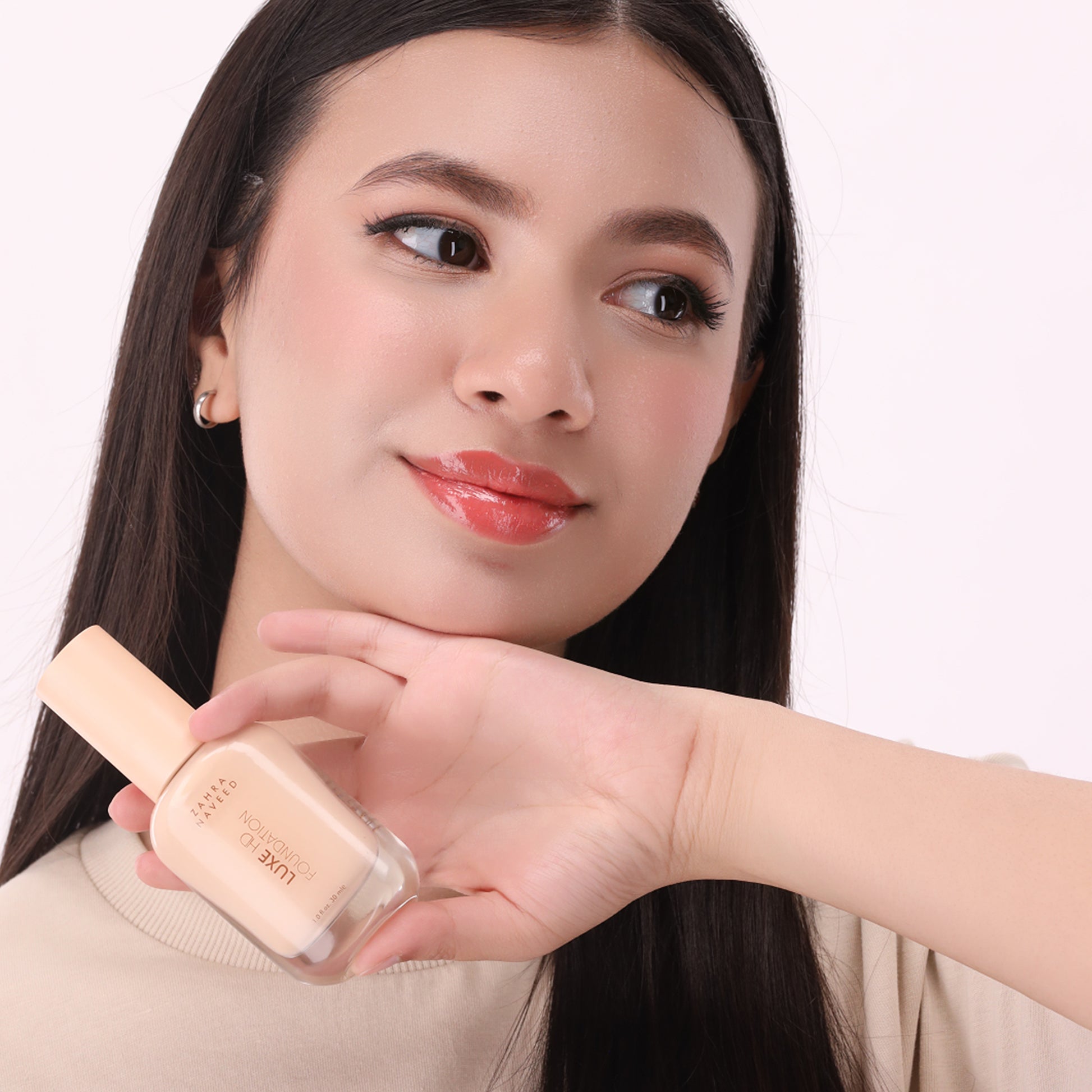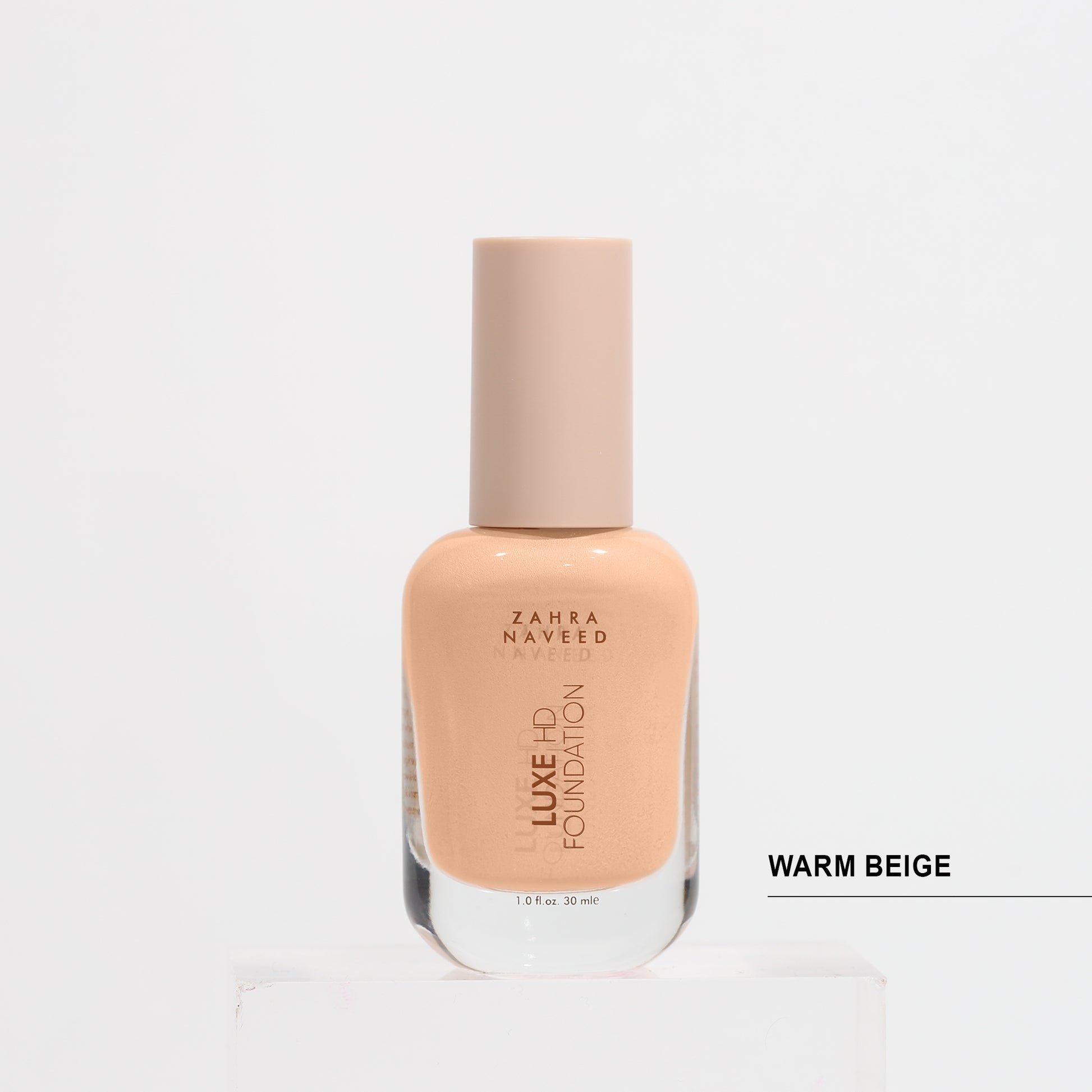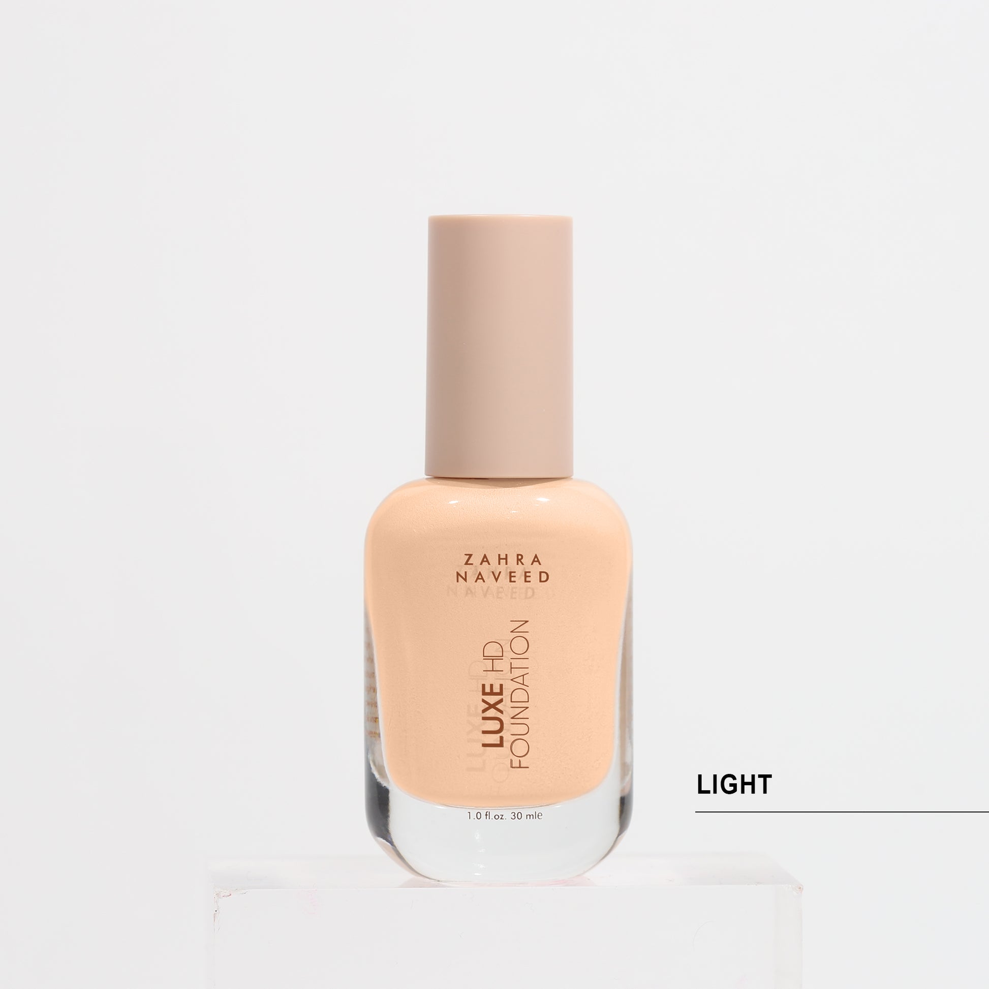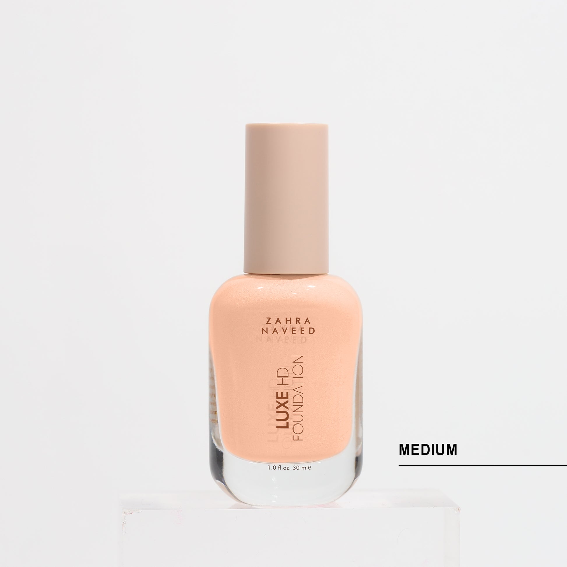 LUXE HD FOUNDATION A medium coverage, radiant foundation, designed to provide a balanced finish, offering enough coverage to even out the complexion while still allowing some natural skin texture to show through. It delivers a luminous, glowing effect that enhances the skin’s radiance without being overly dewy or heavy.